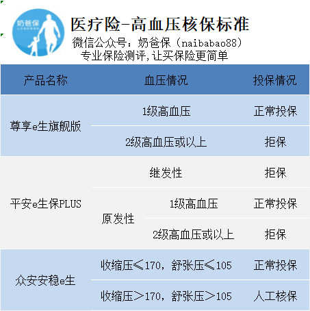 众安安稳e生对血压的核保要求最为宽松,部分2级高血压人群也可以正常核保。
