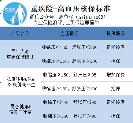 百年康惠保(旗舰版)、弘康哆啦A保、弘康健康一生对于部分1-2级高血压,只要符合承保条件,还是可以投保的。昆仑健康保、信美三叶草对于血压超出正常范围的人群拒保。