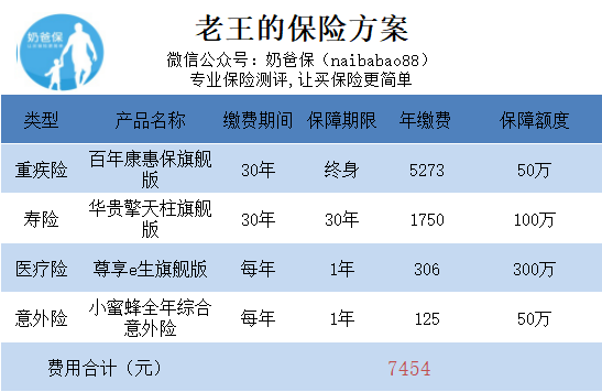 我们看到,老王并非标准体,由于血压偏高,且接近2级高血压的情况下,一年保费7454元能选到合适的50万的重疾险、100万的寿险、300万的医疗险及50万的意外险,还算不错的保障组合。