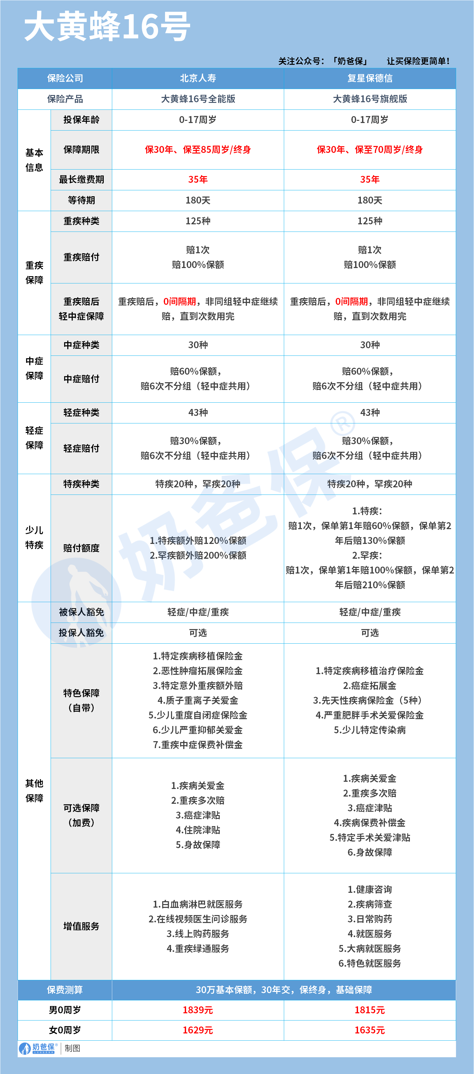 北京人寿复星保德信联合推出的大黄蜂 16 号,是热门少儿重疾险产品。