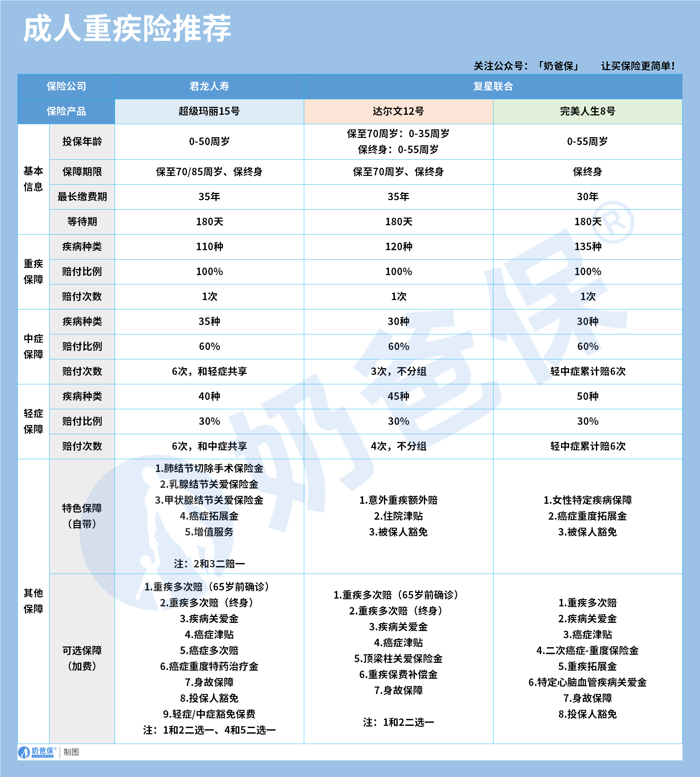 结合图片中的重疾险产品,完美人生 8 号可保至终身,达尔文 12 号支持重疾多次赔,能根据家庭需求选择适配产品,筑牢家庭财务防线。