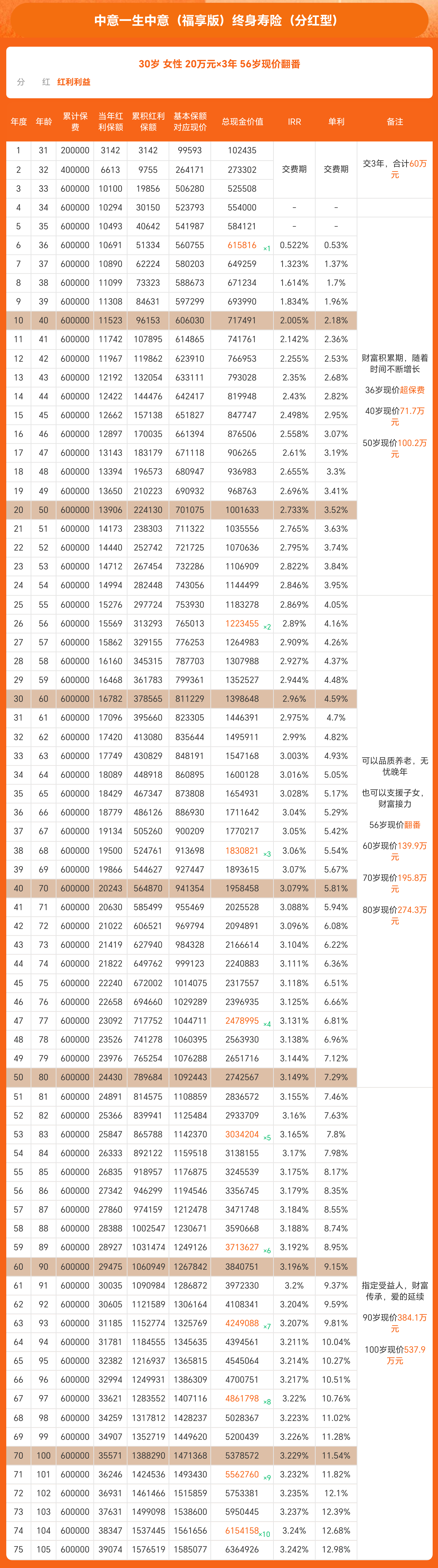 现金价值(含分红)达195.8万,是总保费的3.26倍,IRR突破3.0%!