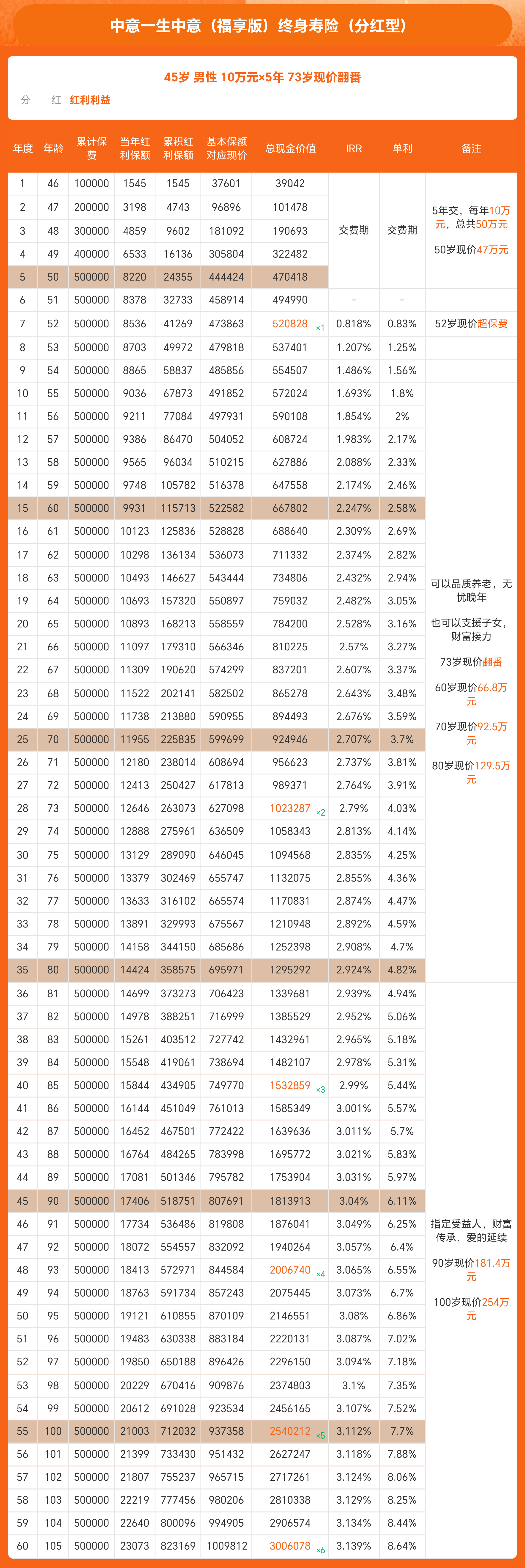 现金价值(含分红)达140.7万,是总保费的1.4倍,