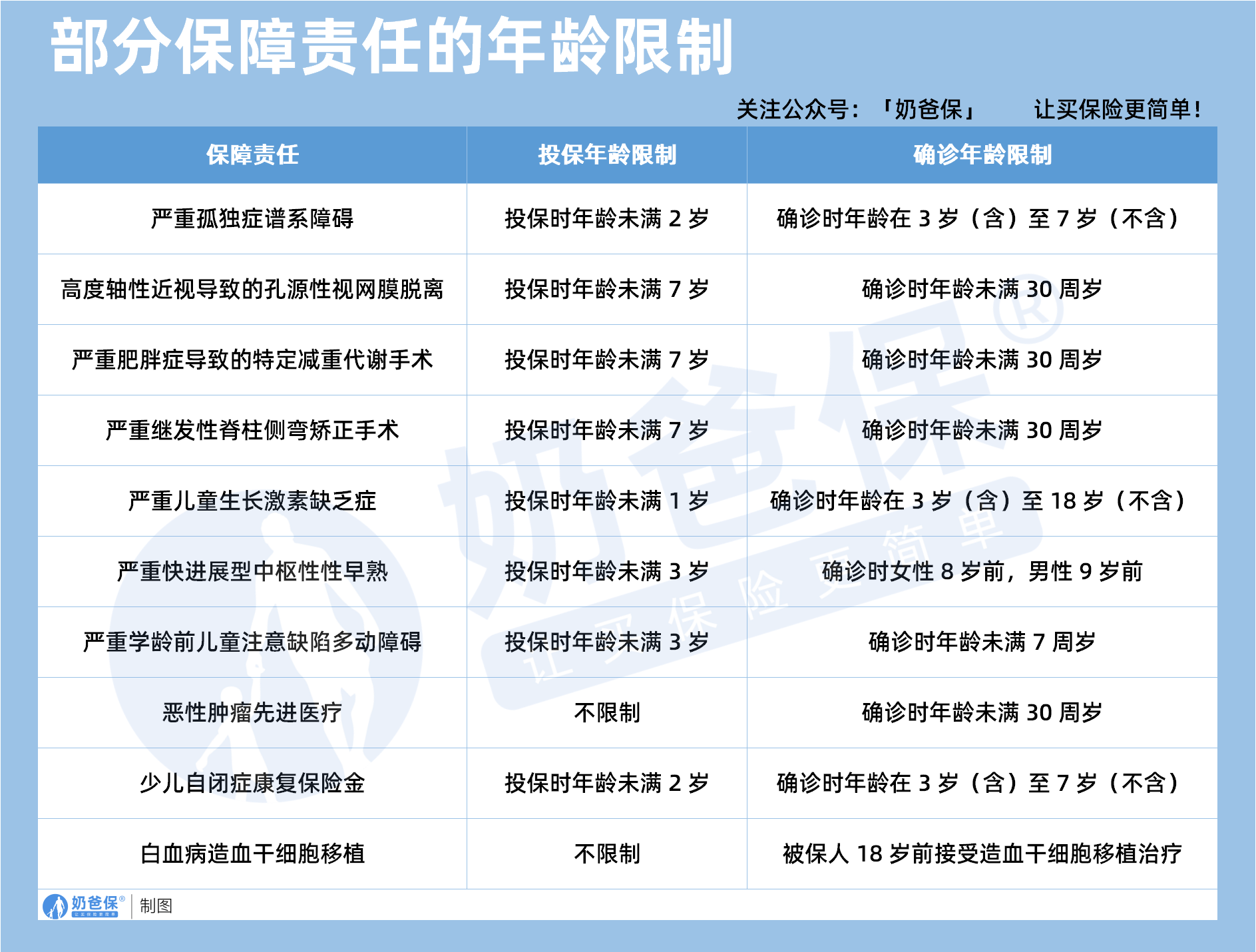 比如严重孤独谱系障碍和少儿自闭症康复责任,要求投保时年龄未满2周岁,且确诊时年龄在3至7周岁之间;严重儿童生长激素缺乏症要求投保时未满1周岁,确诊时在3至18周岁之间;