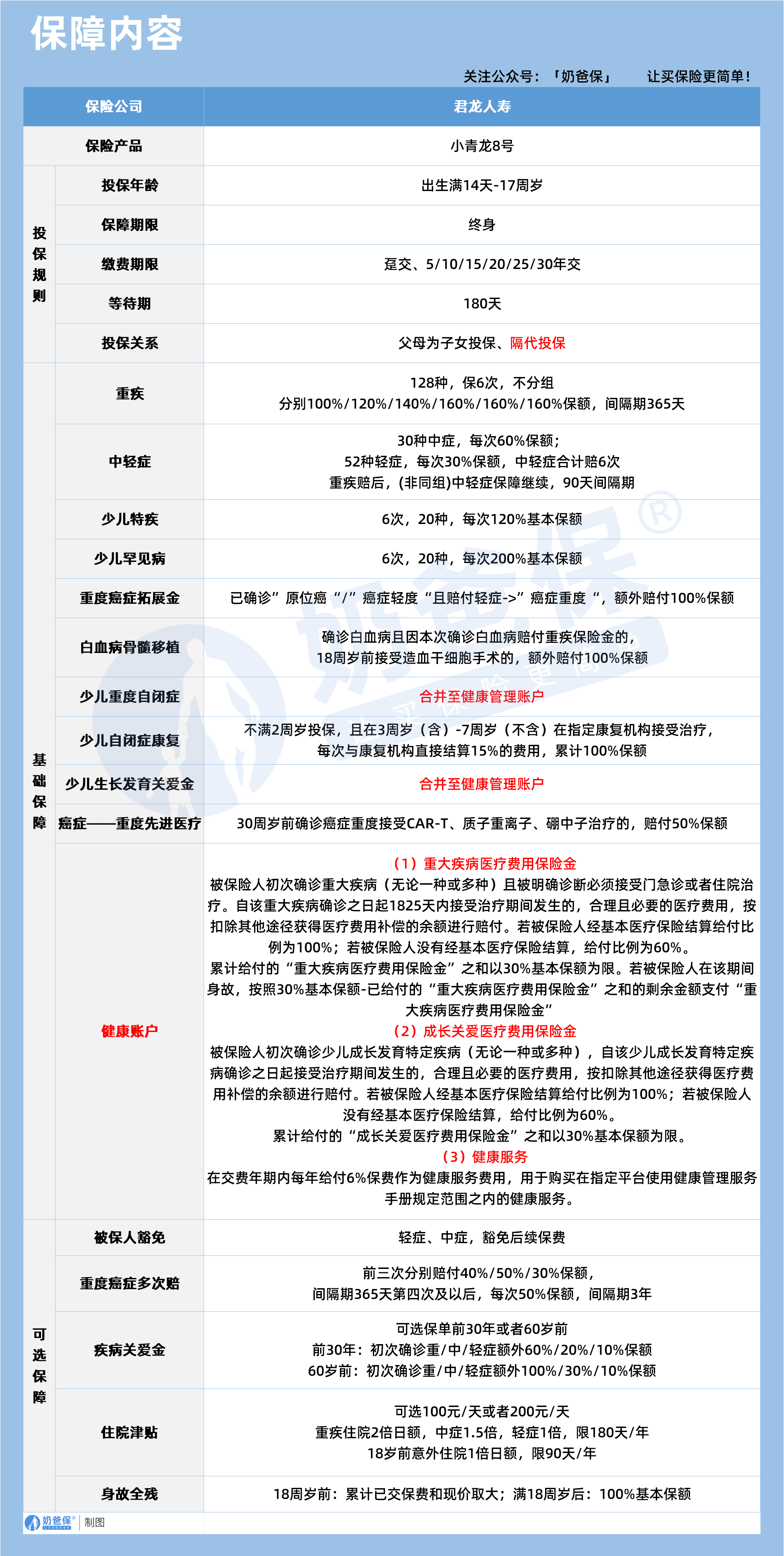 整体而言,君龙小青龙 8 号重疾险适合为孩子投保,其核心优势十分突出。