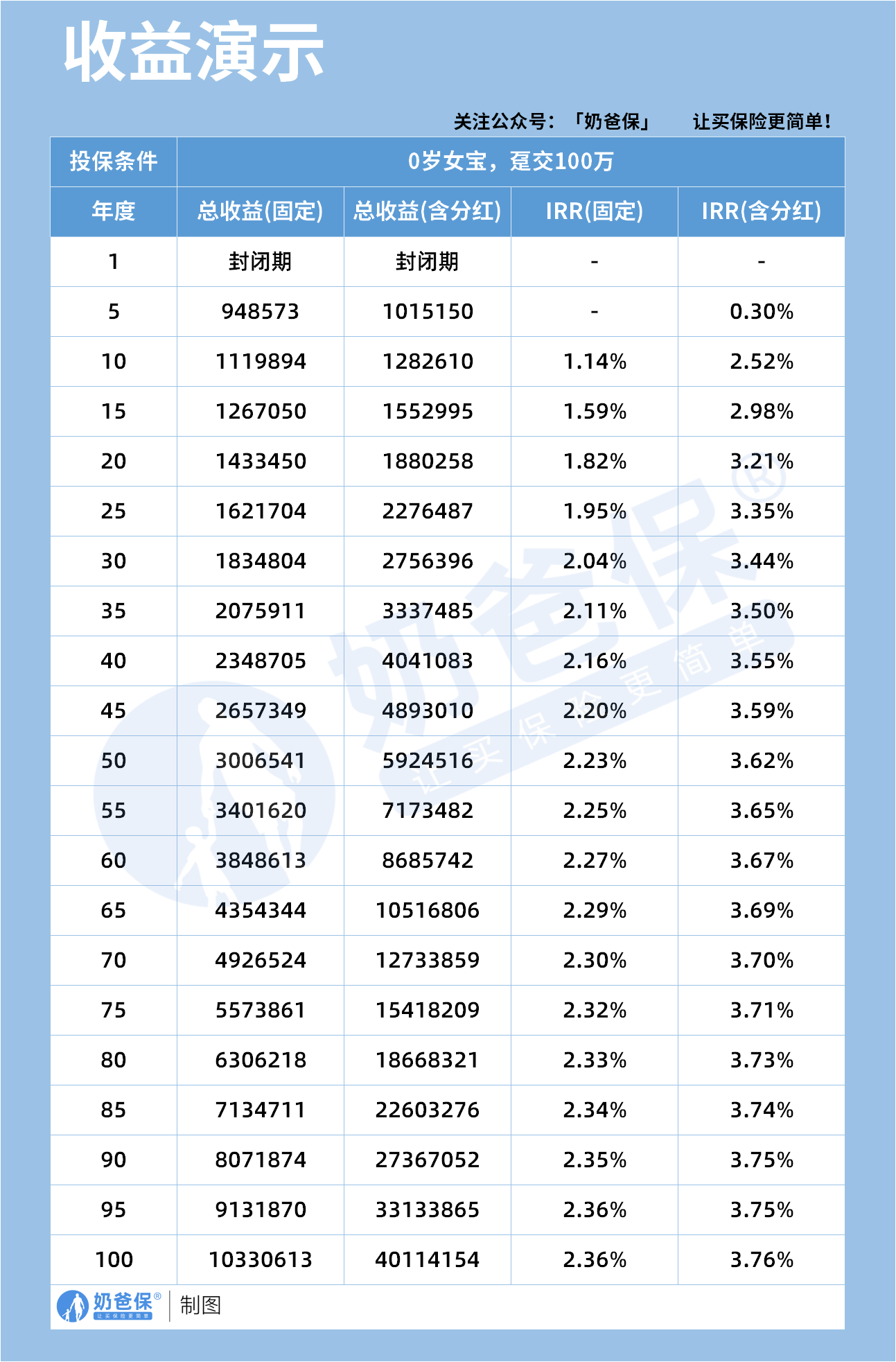 本次收益演示以 0 岁女宝、趸交 100 万为条件,展示固定与含分红两类收益表现。