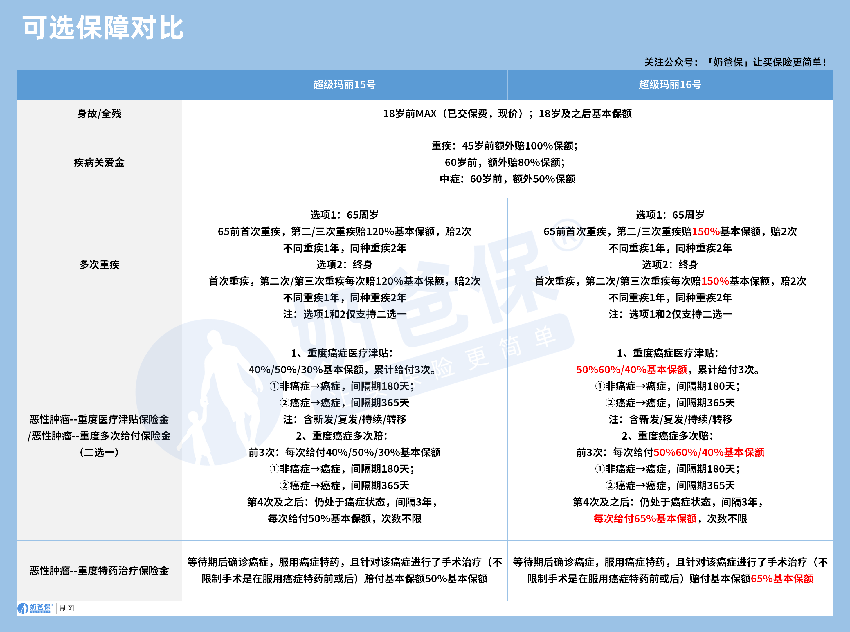 而超级玛丽16号的多次重疾,第二、三次重疾的赔付比例直接提升到150%基本保额,间隔期要求和15号一致。