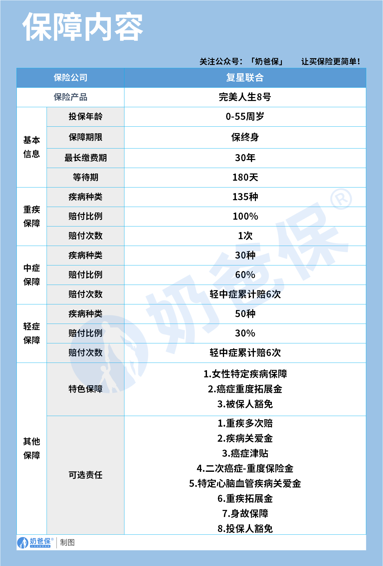首先看基础保障,完美人生8号覆盖135种重大疾病,