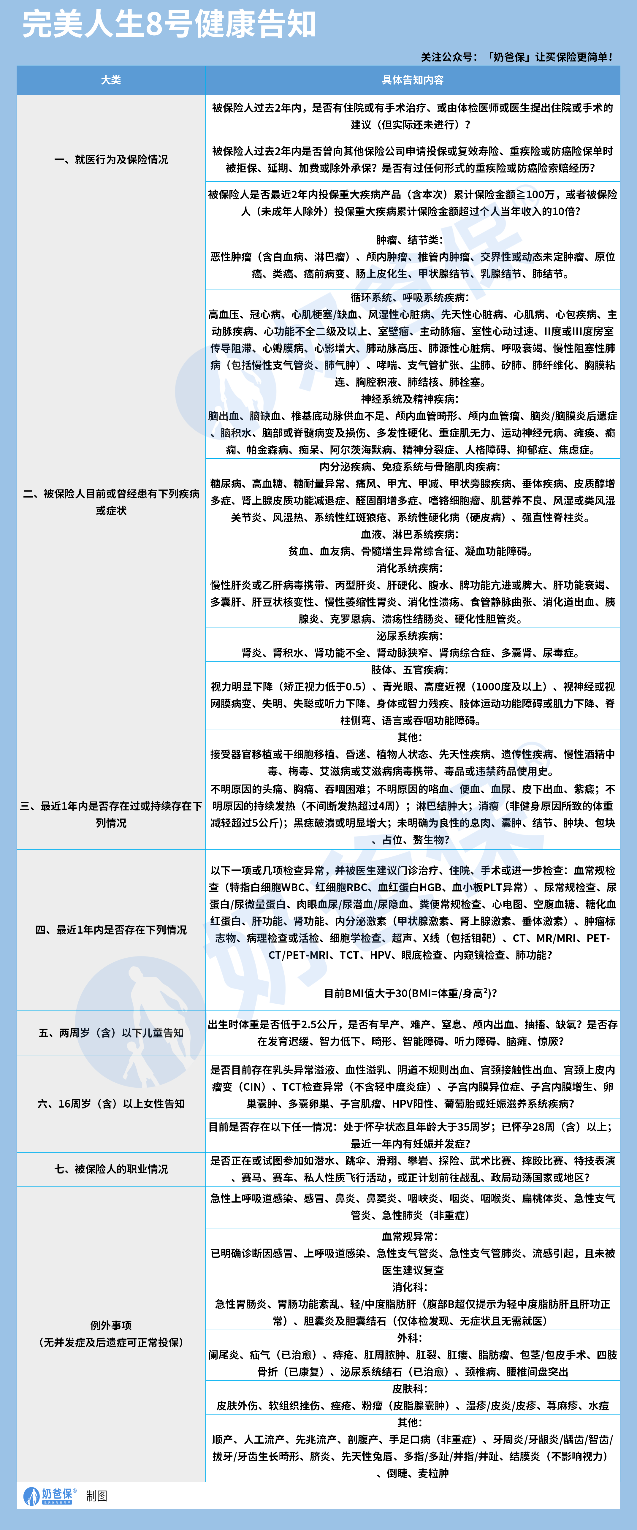 完美人生8号的健康告知,整体设计十分人性化,既覆盖了必要的风险问询,也给了很多常见小异常的投保空间。