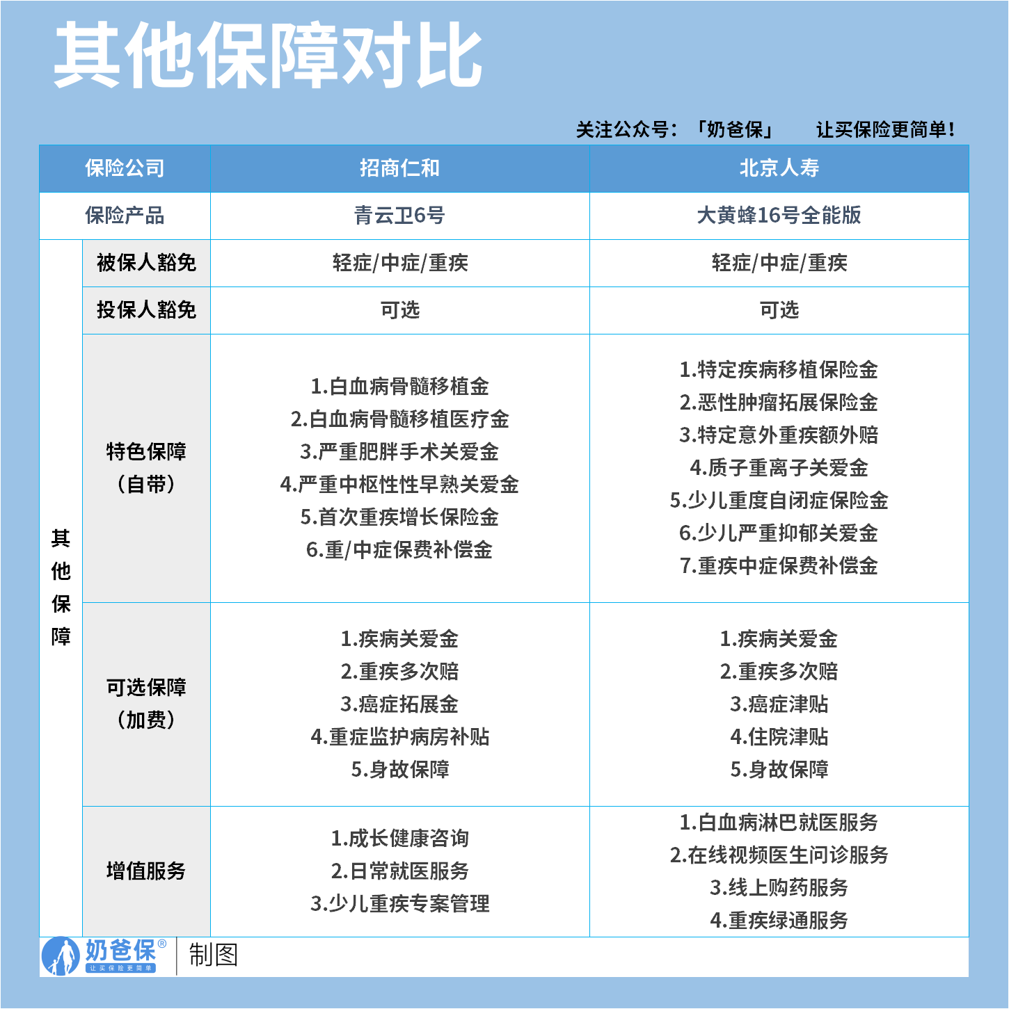 两款产品都做到了重疾后中轻症保障不终止,是少儿重疾险中非常优秀的设计,能给孩子更长期的全面保障。