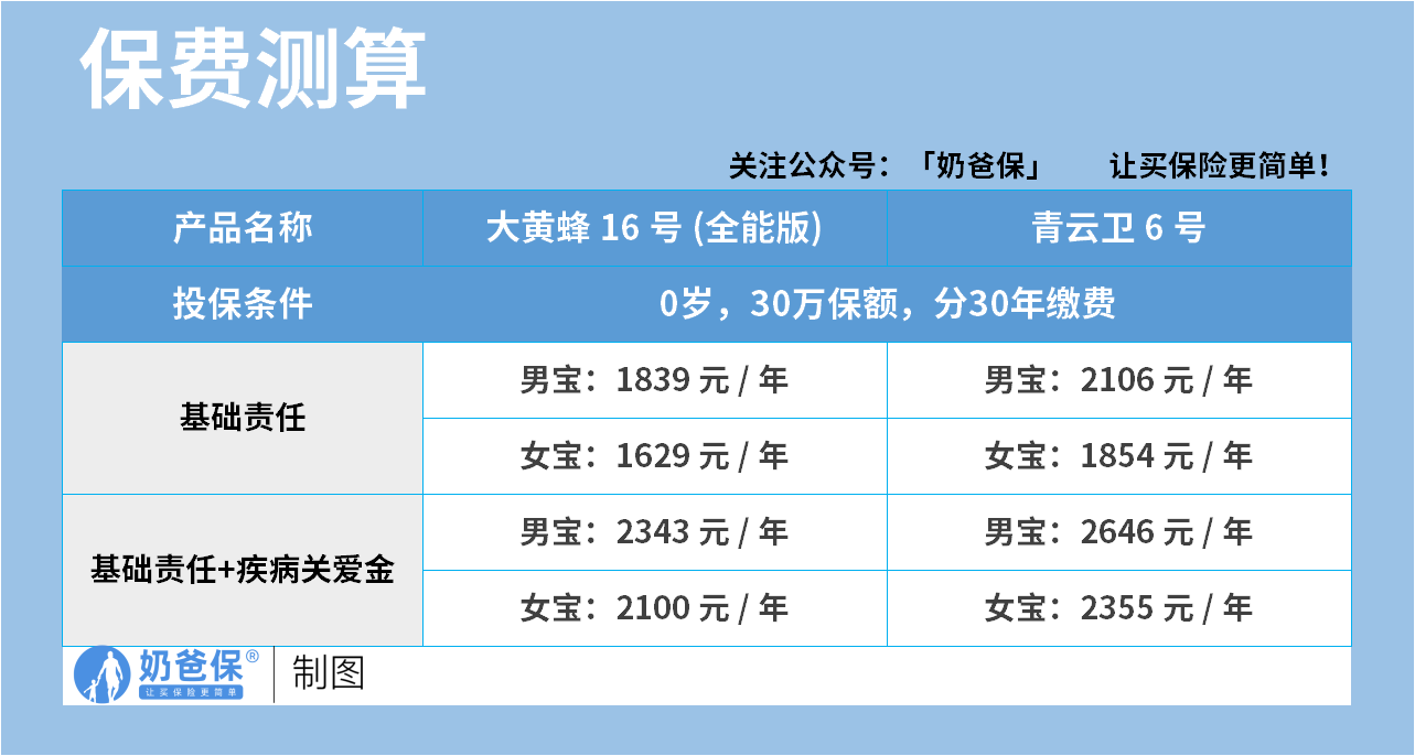 在基础责任加疾病关爱金的情况下,大黄蜂16号全能版男宝每年2343元,女宝每年2100元;青云卫6号男宝每年2646元,女宝每年2355元。