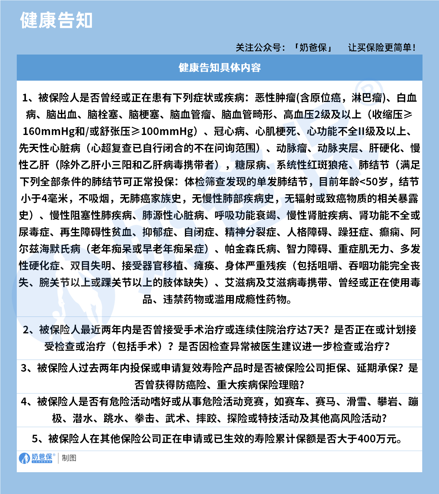 擎天柱12号的健康告知一共分为五条,整体门槛较为宽松,对非标体人群比较友好。