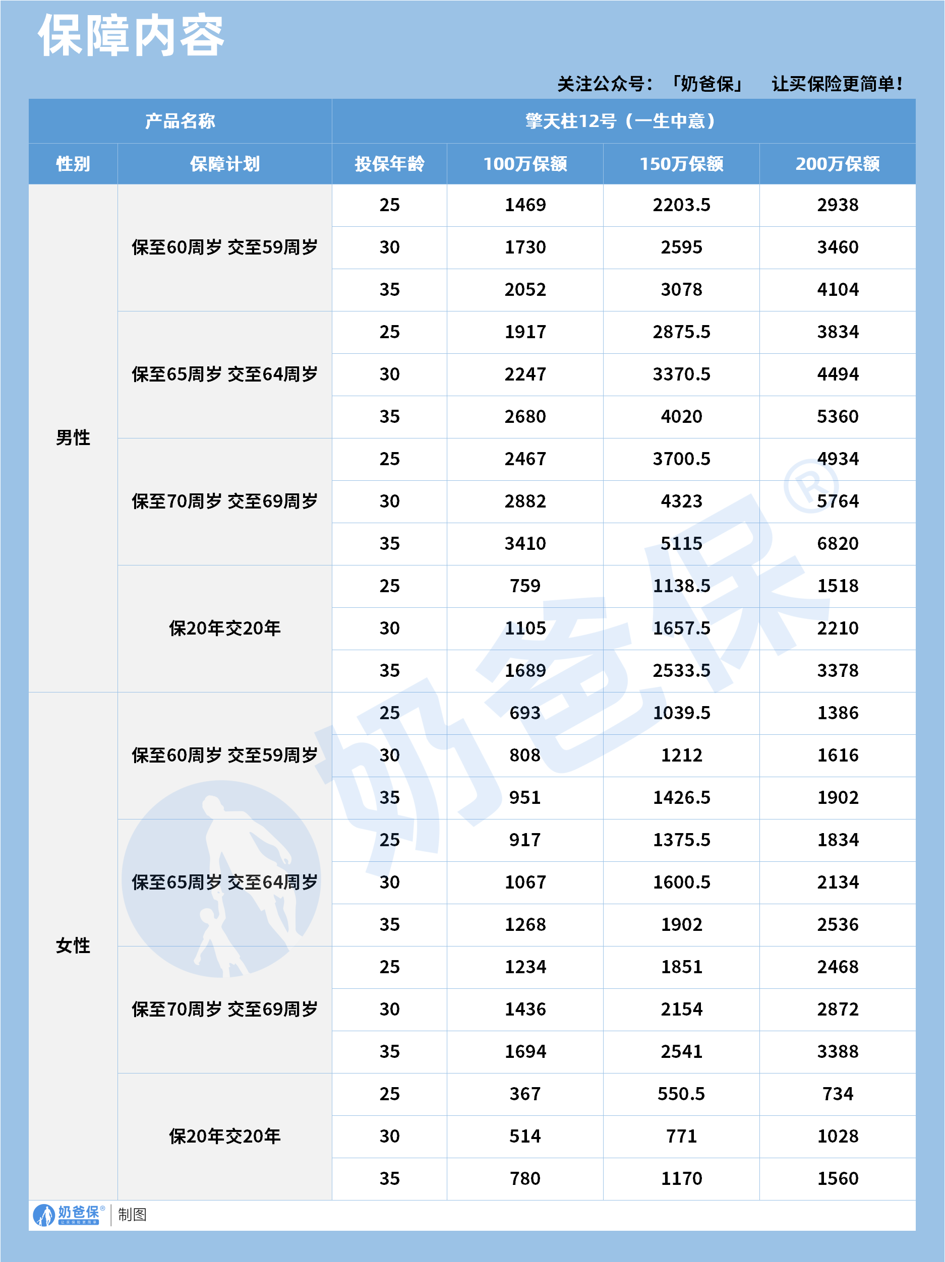 擎天柱12号的保费根据性别、保障计划、投保年龄、保额的不同,