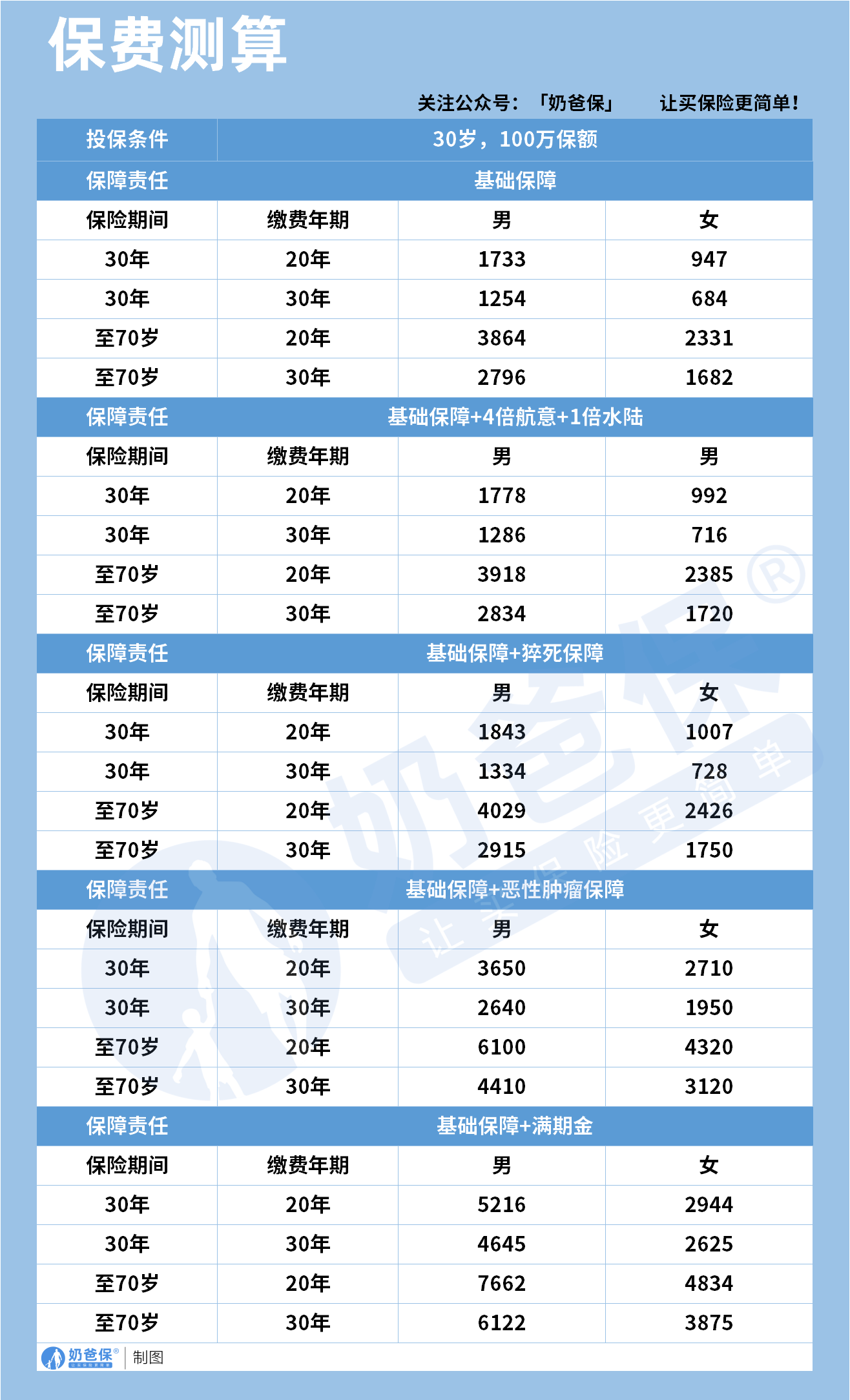 我们以30岁人群,100万基本保额为例,来看不同方案下的保费成本。