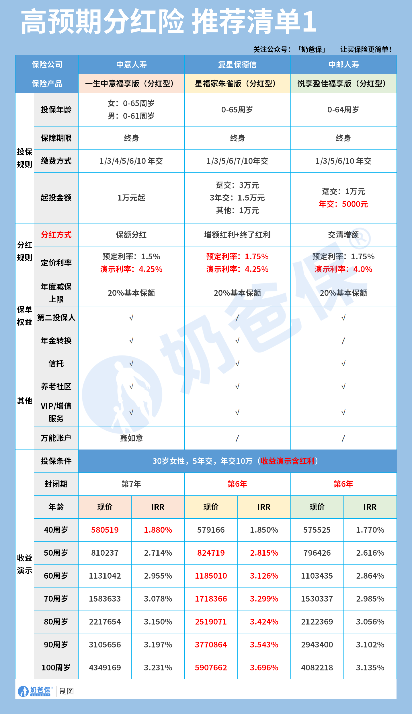30岁女性,5年交,年交10万,叠加红利收益,