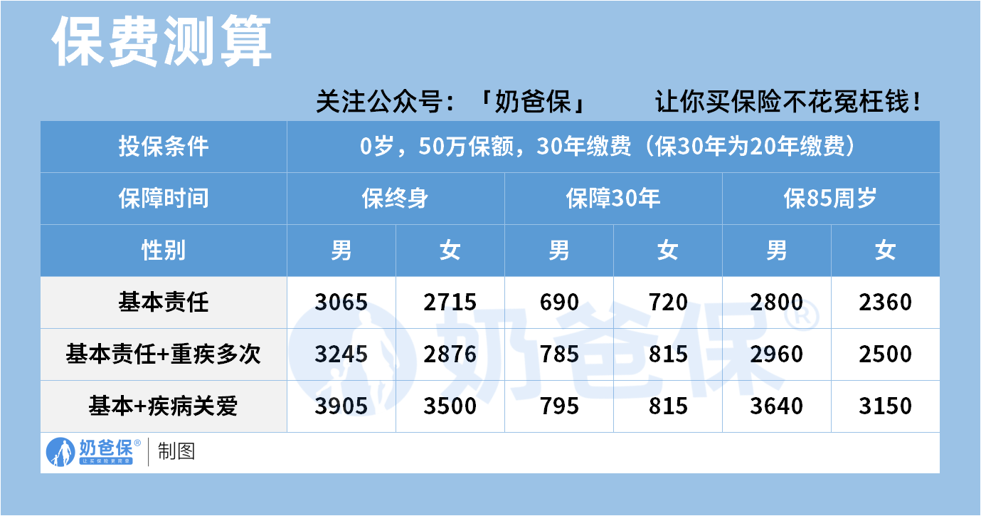 这个保障期的最大优势是保费极低,从保费测算来看,0岁孩子50万保额,保30年20年缴费,基本责任每年的保费仅需几百元,对于预算有限的家庭来说,几乎没有压力。