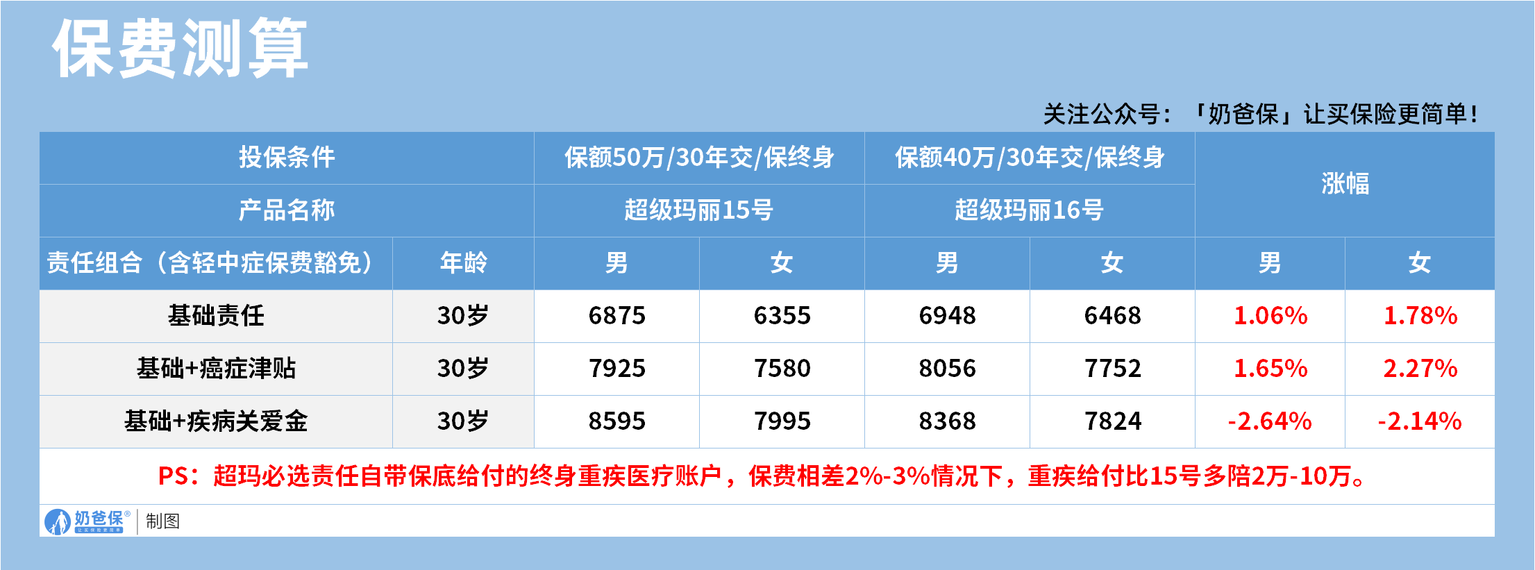 基础责任加癌症津贴的组合,男性保费上涨1.65%,女性上涨2.27%,