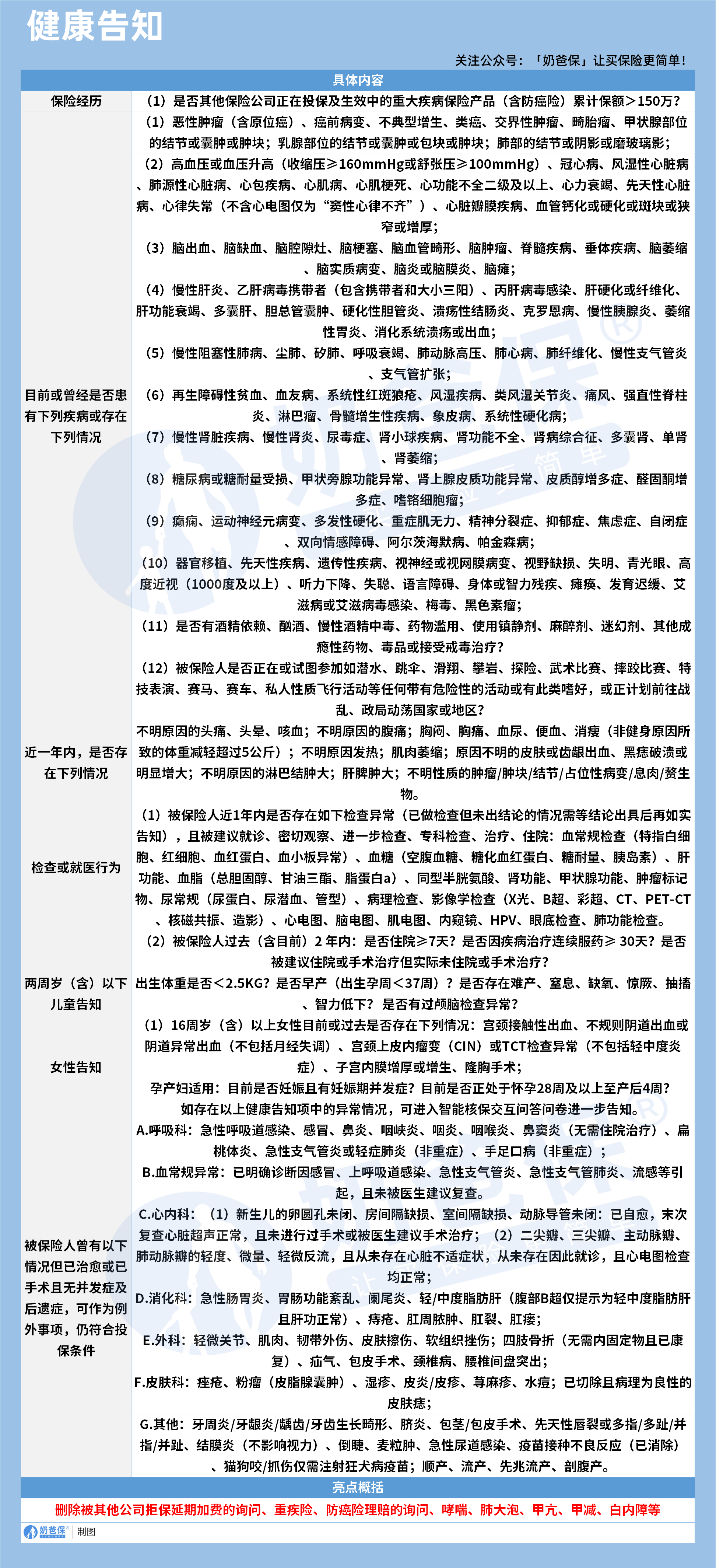 产品删除了大量其他公司会要求拒保延期加费的问询内容,