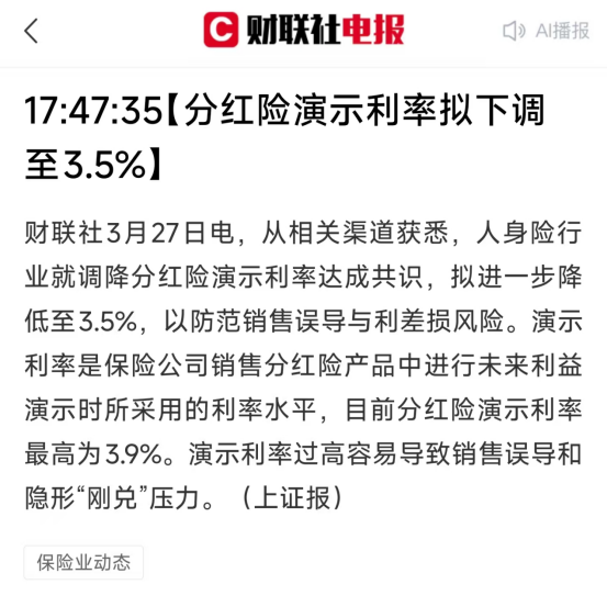 从市场环境来看,近期也正是官宣,分红险的演示利率会下调至3.5%,