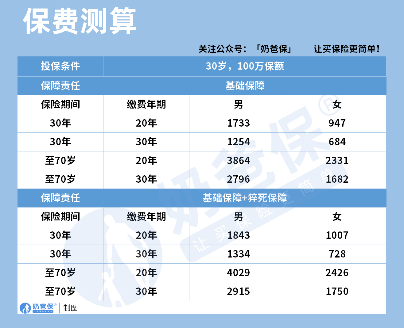 保至70岁、交30年,基础保障2796元,加猝死保障2915元,30岁女性保费更低,保30年交20年,基础保障才947元。