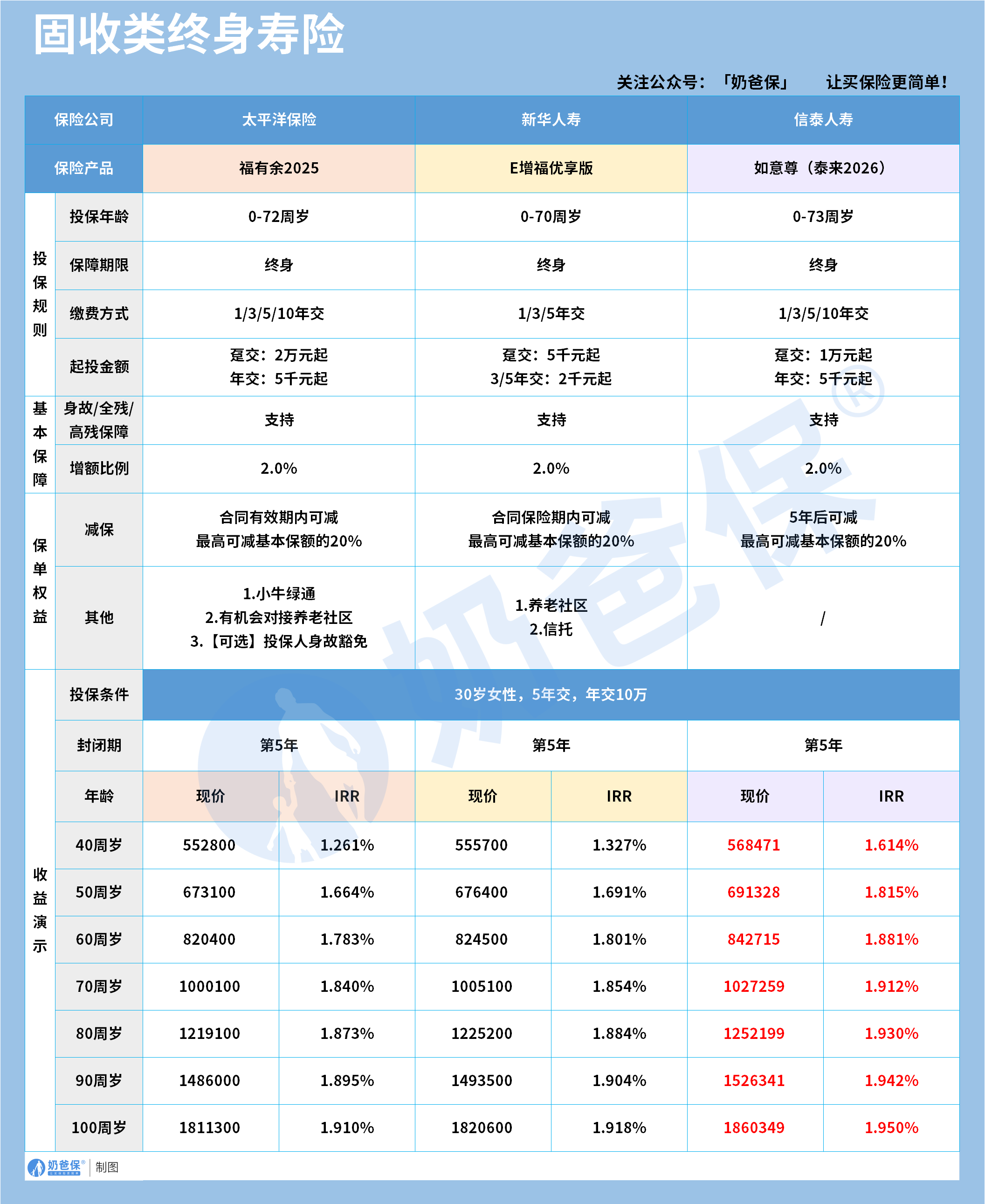 本次对比的三款固收类产品,太平洋福有余2025、新华E增福优享版、信泰如意尊泰来2026,基础保障完全一致,都提供终身身故全残高残保障,保额按2.0%的固定比例逐年递增,保障责任清晰稳定,能为被保险人提供终身的风险兜底。