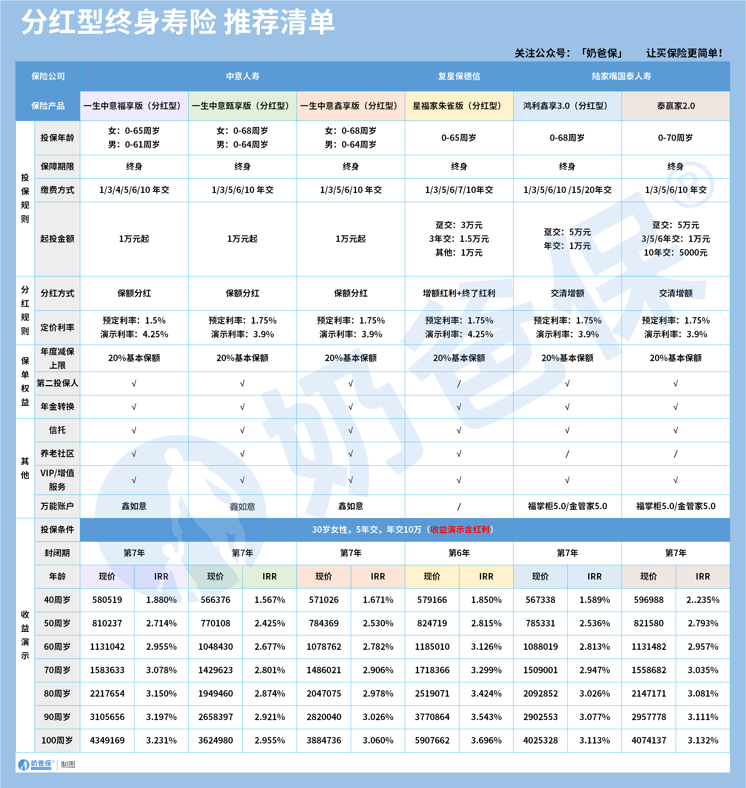 本次对比的六款分红类产品,中意一生中意福享版、一生中意甄享版、一生中意鑫享版、复星保德信星福家朱雀版、陆家嘴国泰鸿利鑫享3.0、泰赢家2.0,基础保障均为终身身故保障,