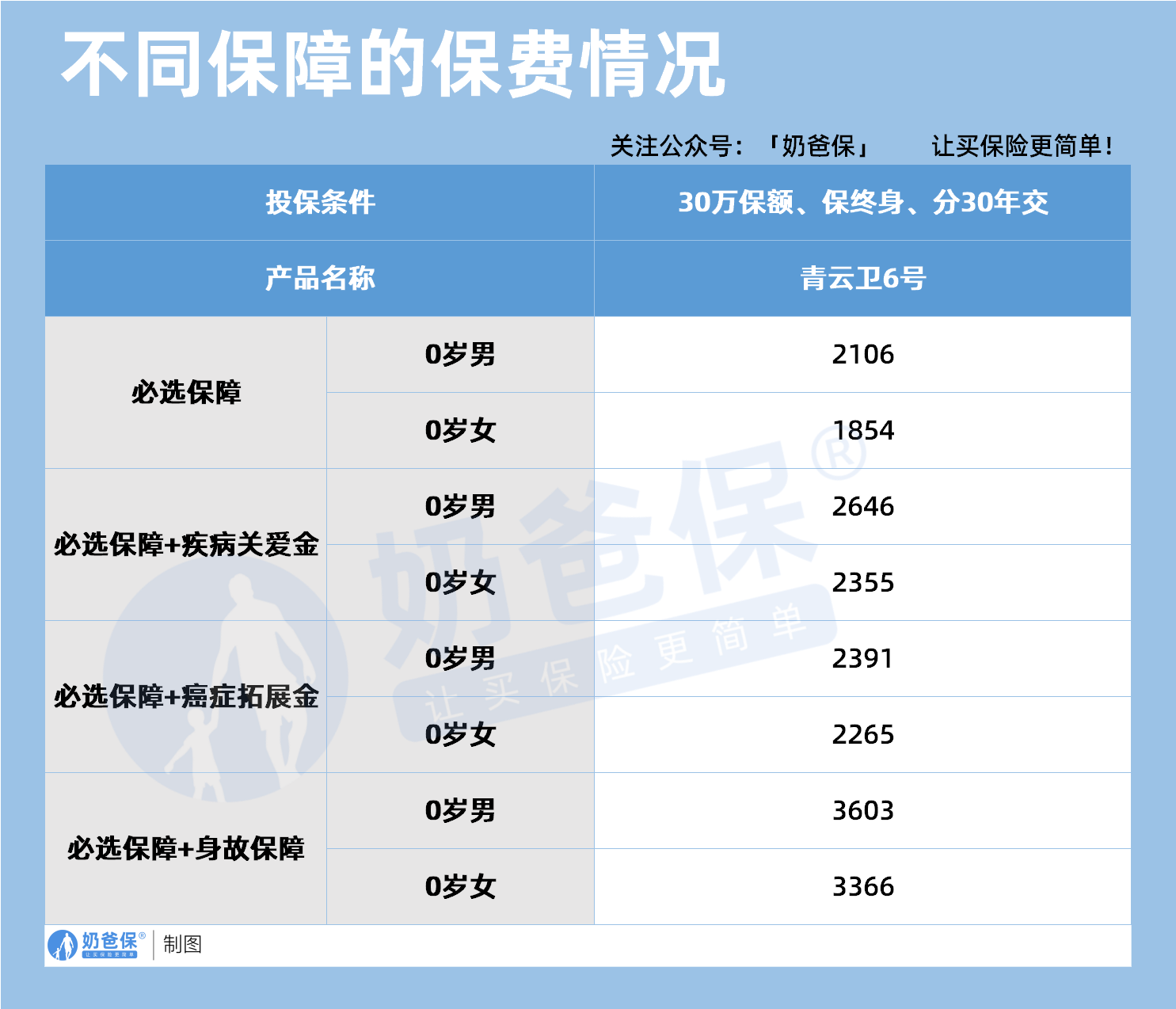 必选保障的情况下,0岁男宝宝每年保费2106元,0岁女宝宝1854元。