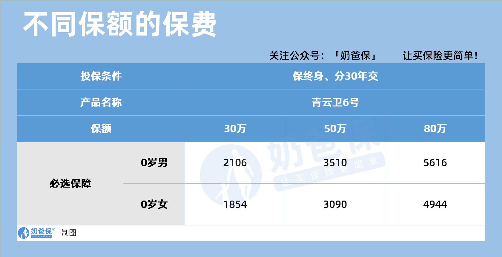 保额的高低也会影响保费,奶爸以保终身分30年交的必选保障为例,