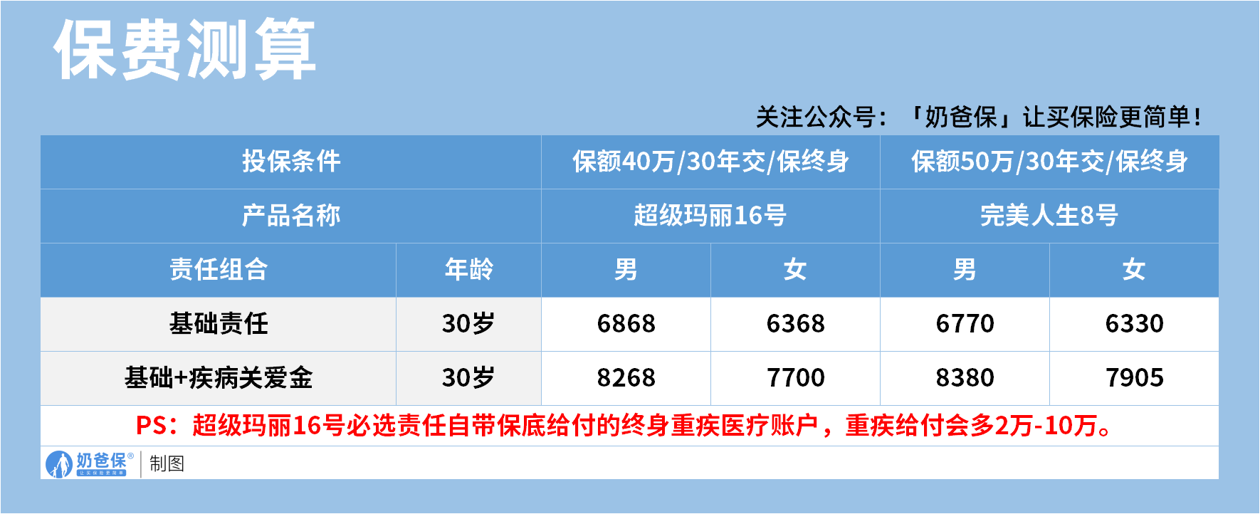 其中超级玛丽16号按40万保额测算,完美人生8号按50万保额测算。