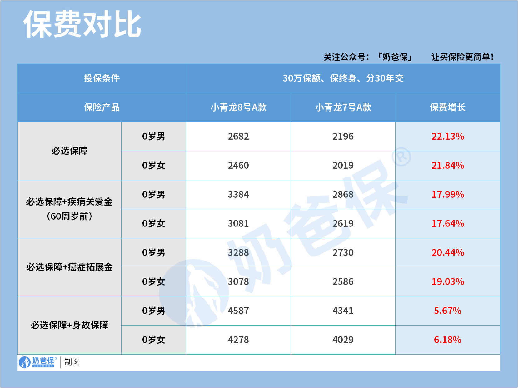 0岁男宝宝的保费从2196元上涨至2682元,涨幅达到了22.13%。