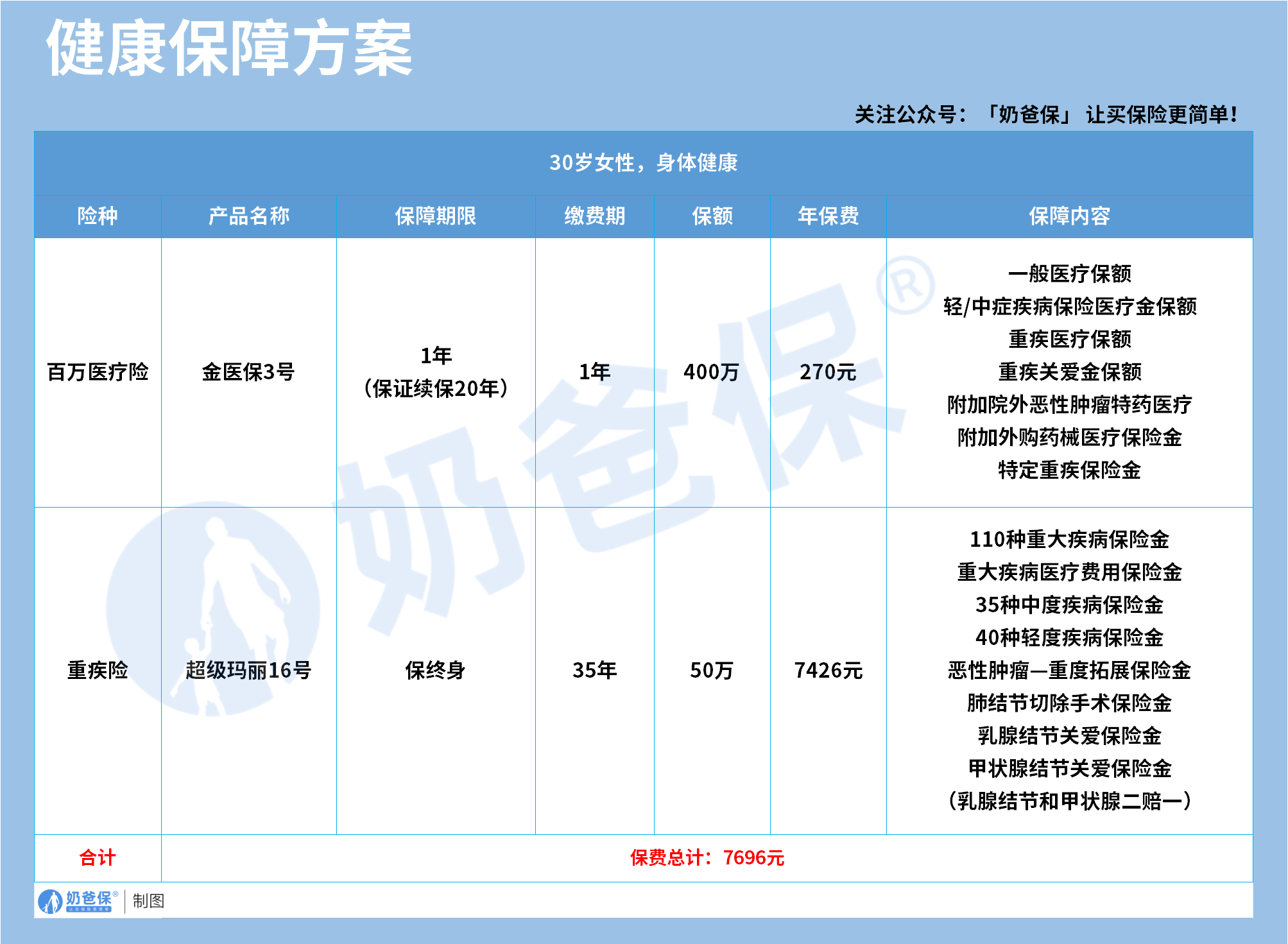我们分别从重疾险和医疗险两个维度,推荐适合的产品,再组合成完整的保障方案。