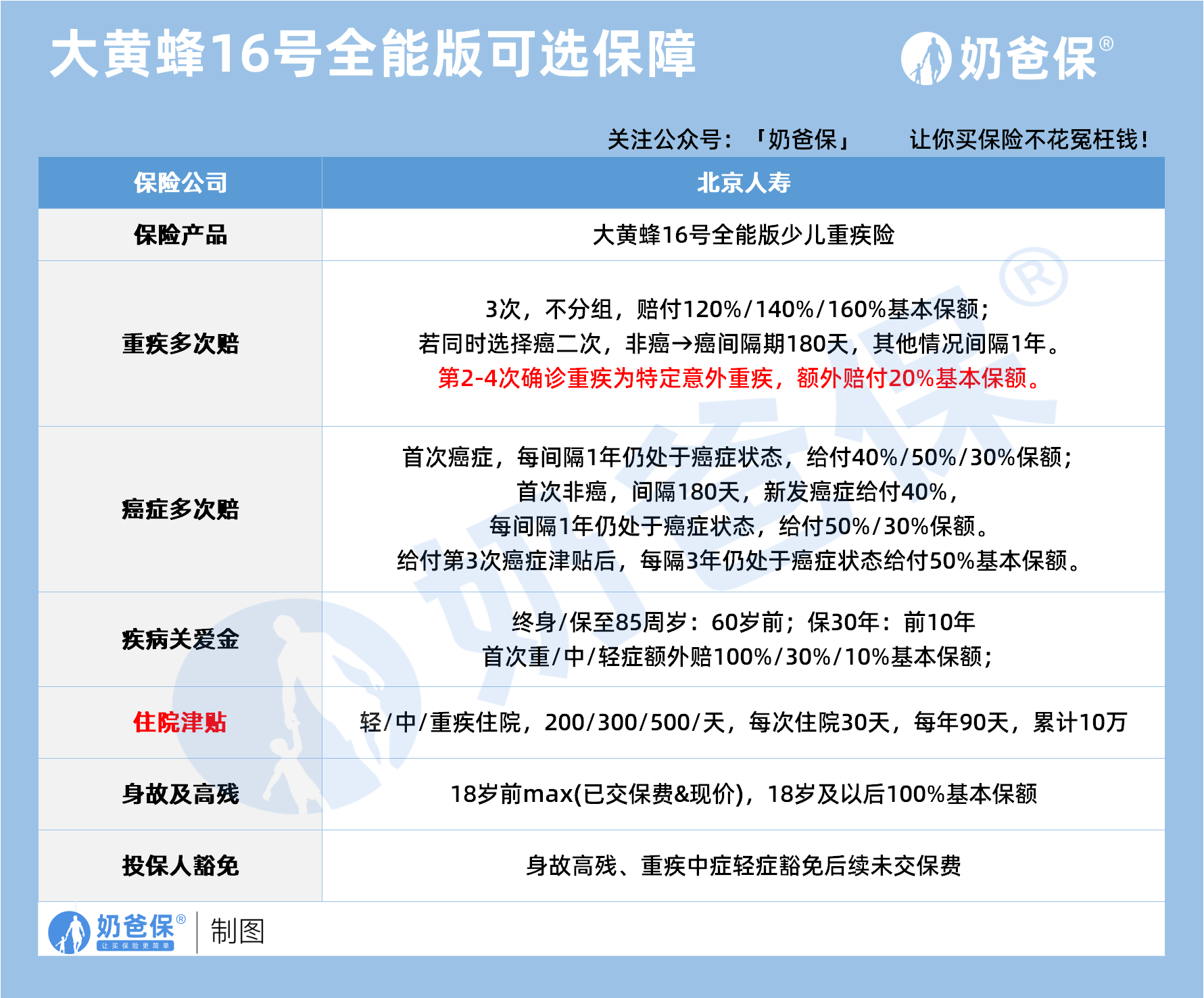 除了必选的基础和特色保障,产品的可选保障也非常实用,其中最值得关注的是重疾多次赔和住院津贴。