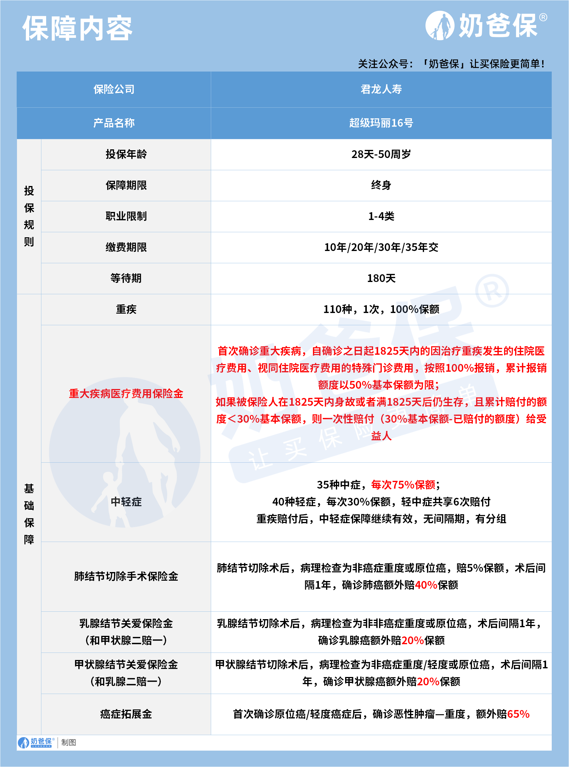 职业限制为 1 至 4 类,多数普通职业人群都可顺利投保,等待期为 180 天,符合行业常规设置。