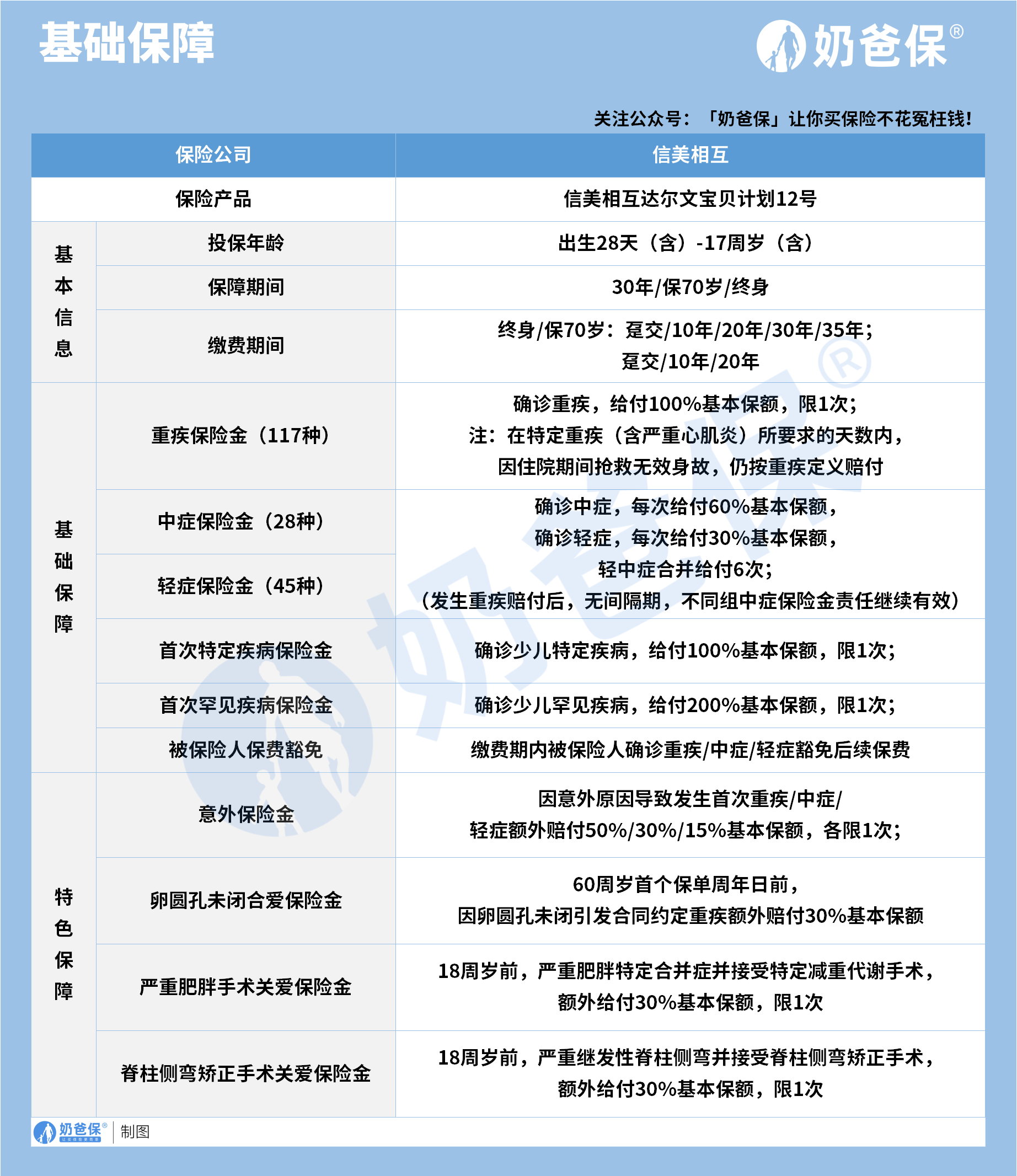 综合来看,信美相互达尔文宝贝计划 12 号是一款保障全面,针对性较强的少儿重疾险产品。
