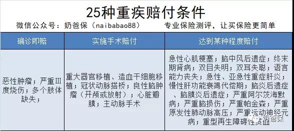 1、如果只购买重疾险关于重疾险,奶爸曾经做过详细的测评过:最适合工薪家庭的消费型重疾险。通过对25种法定高发重疾的条款分析,其理赔条件分为3种:确诊即赔、实施手术赔付、达到某种程度赔付。换句话说,并非所有重疾都是确诊即赔的,还得要符合具体的理赔条件。