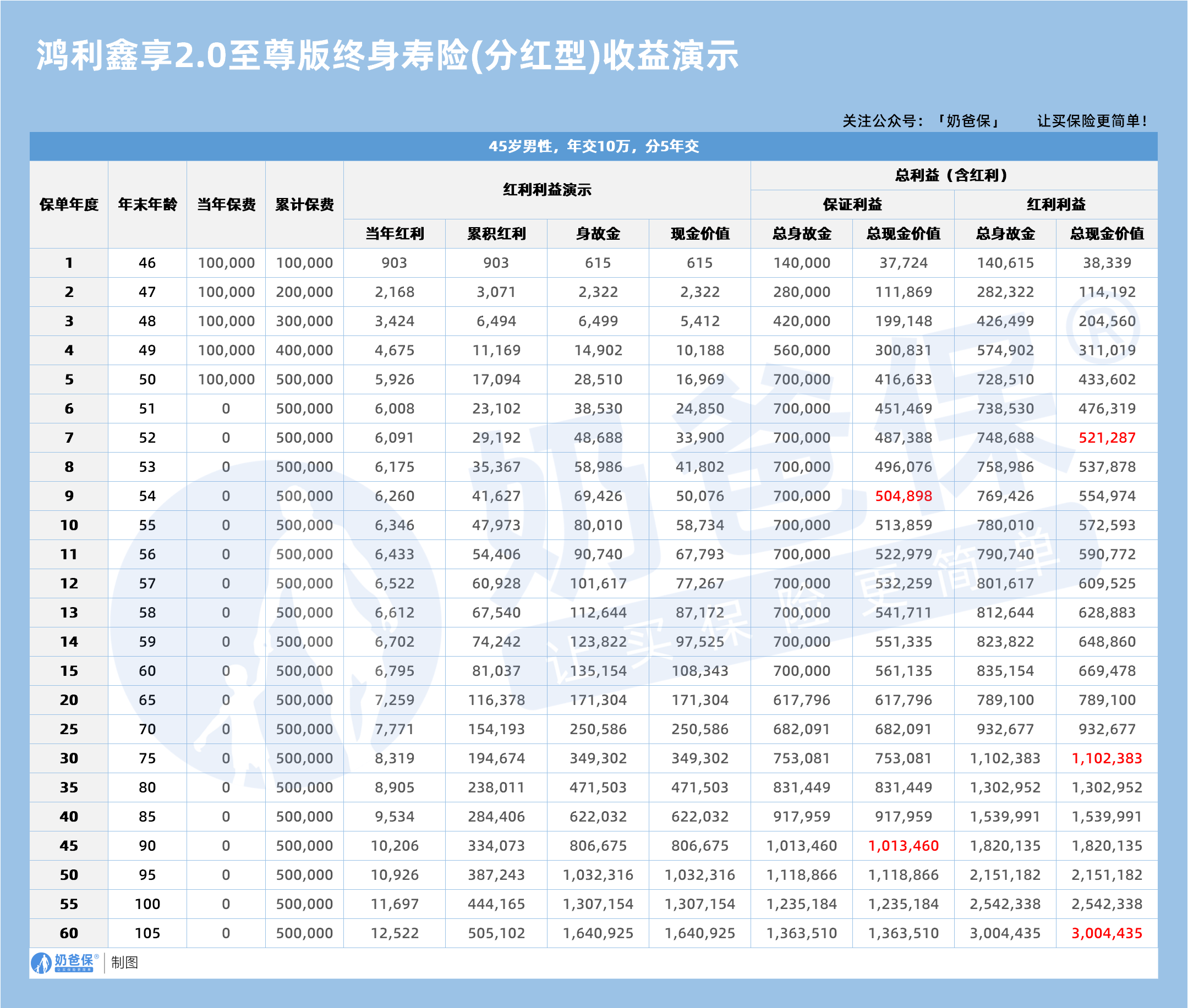 比如 45 岁男性年交 10 万交 5 年的收益情况,我们会讲清保证部分和分红部分的核心差异。