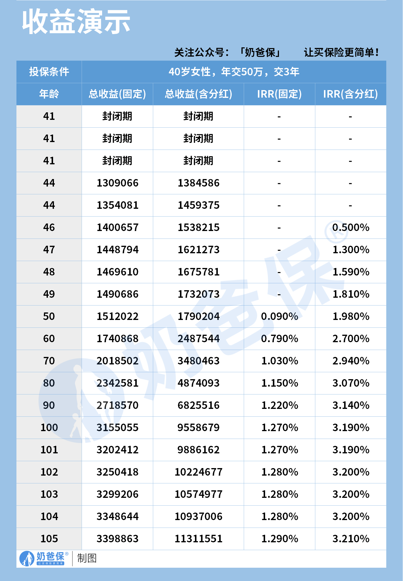 我们以 40 岁女性、年交 50 万交 3 年的一生中意福享版,来算 20 年后也就是 60 岁的收益。