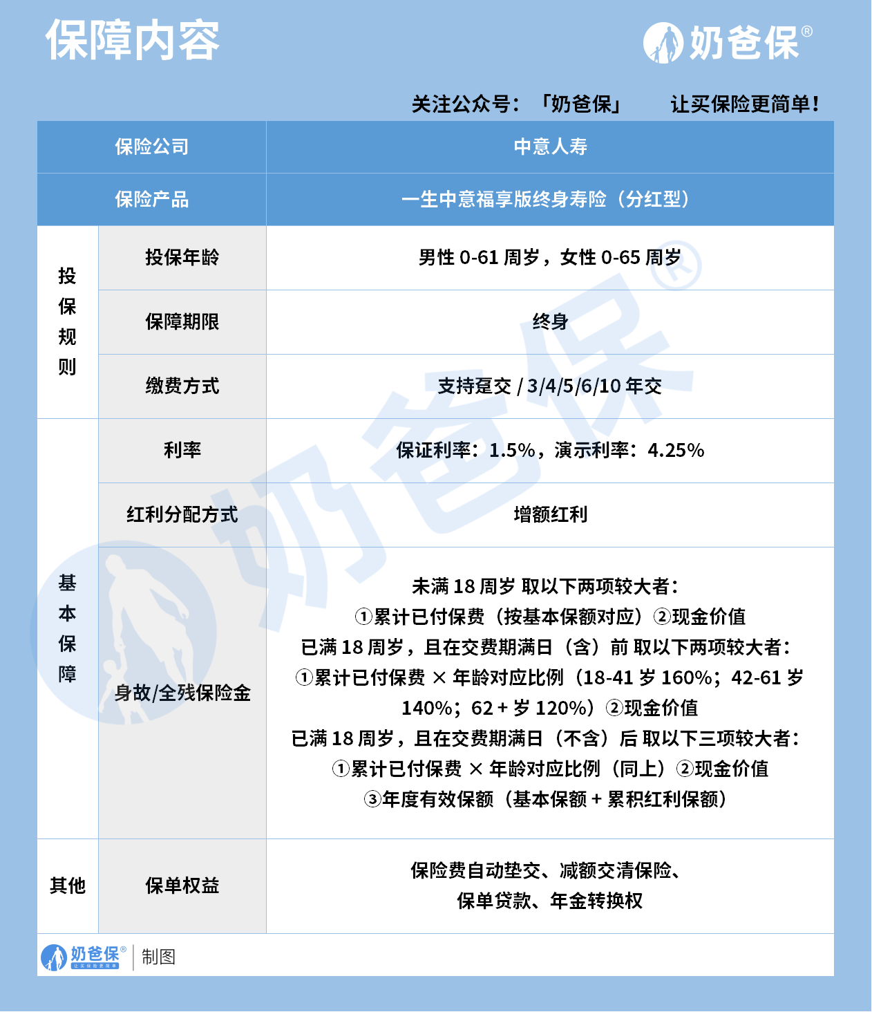 这款产品是中意人寿推出的分红型增额终身寿,有明确的保证利率和演示利率。
