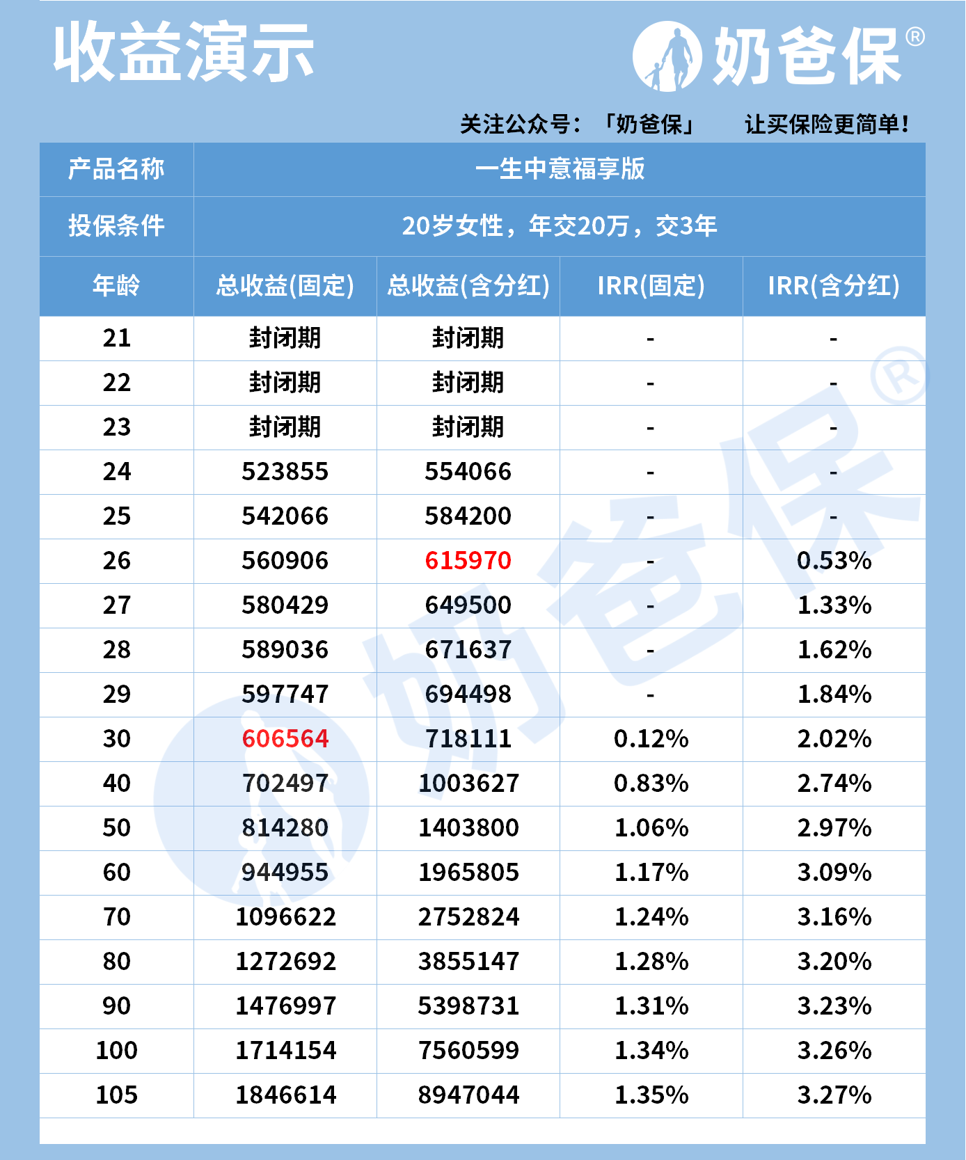 30 岁时,含分红总收益 718111 元,IRR 提升至 2.02%,收益开始明显增长。