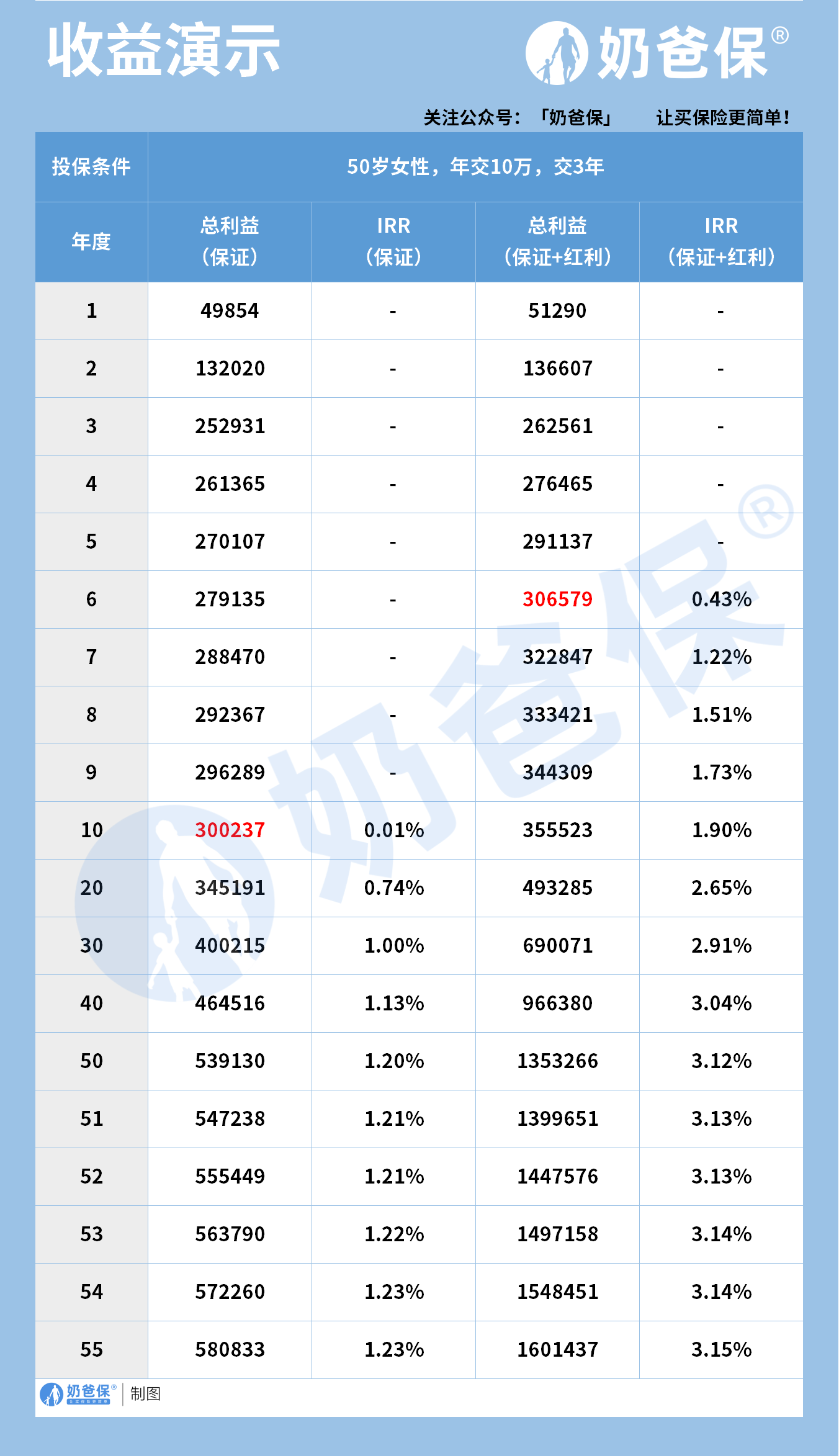 像图中这类产品,持有到第 55 年,保证收益 IRR 约 1.23%,加上红利的 IRR 也仅 3.15% 左右,收益增长节奏偏慢。