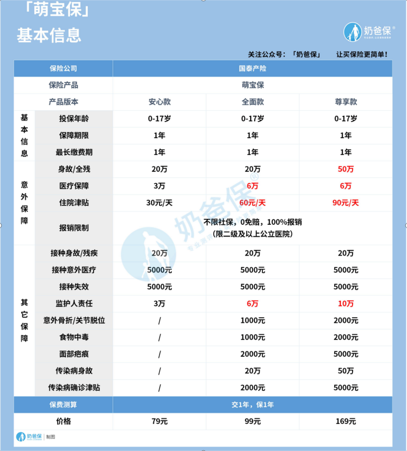 因为安心款是咨询比较多的,所以奶爸就选择这个版本跟市面上的热门少儿意外险做对比测评: